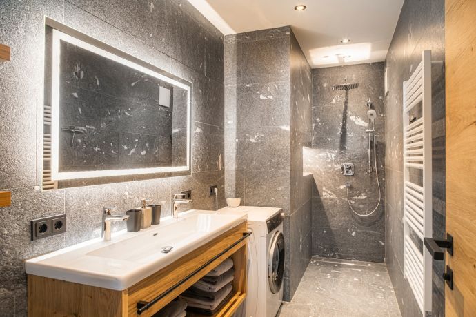 • Stilvolles Badezimmer mit großer, offener Dusche, Doppelwaschbecken, Handtuchtrockner und Föhn